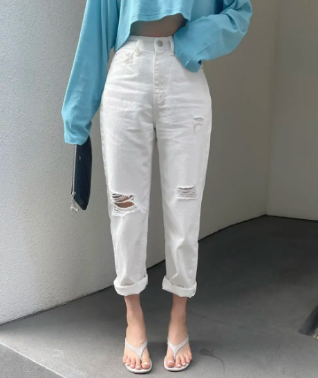 일자핏 하이웨스트 데미지 코튼 팬츠 화이트